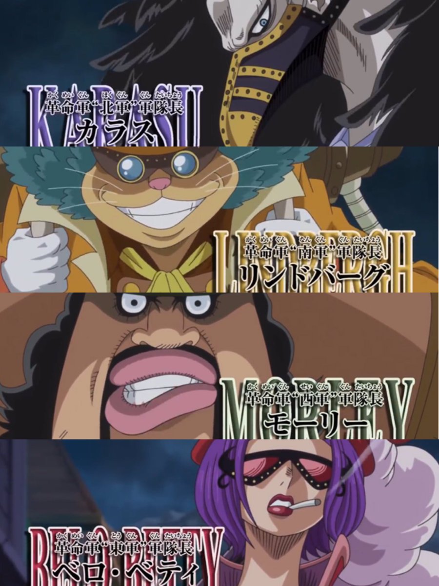 Kei One Piece垢 革命軍の四隊長達かっこ良すぎないカッ モーリー ベロ ベティ リンドバーグ カラス モーリーのキャラは笑った ベロ ベティさん かっこ良すぎます 笑 リンドバーグも予想してた声だった カラス 僕的には